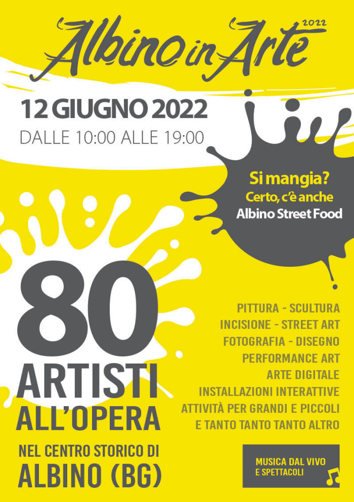 Evento Artistico che si terrà nel centro storico di Albino (BG), il 12 giugno 2022. La manifestazione ospita ottanta artisti che per l’occasione lavorano ed espongono le loro opere in pubblico. L’evento nasce dalla volontà dell’associazione Arte sul Serio di creare un evento di contaminazione artistica, un suolo fertile per l’improvvisazione e la scoperta.
